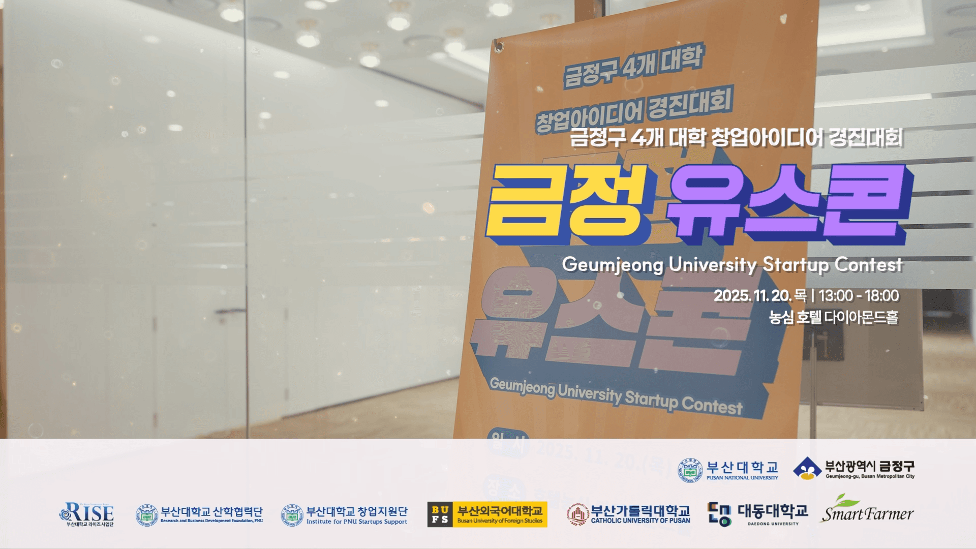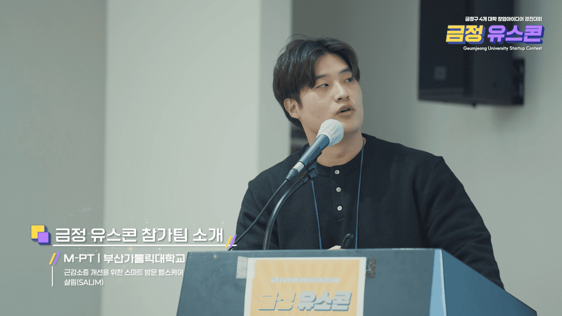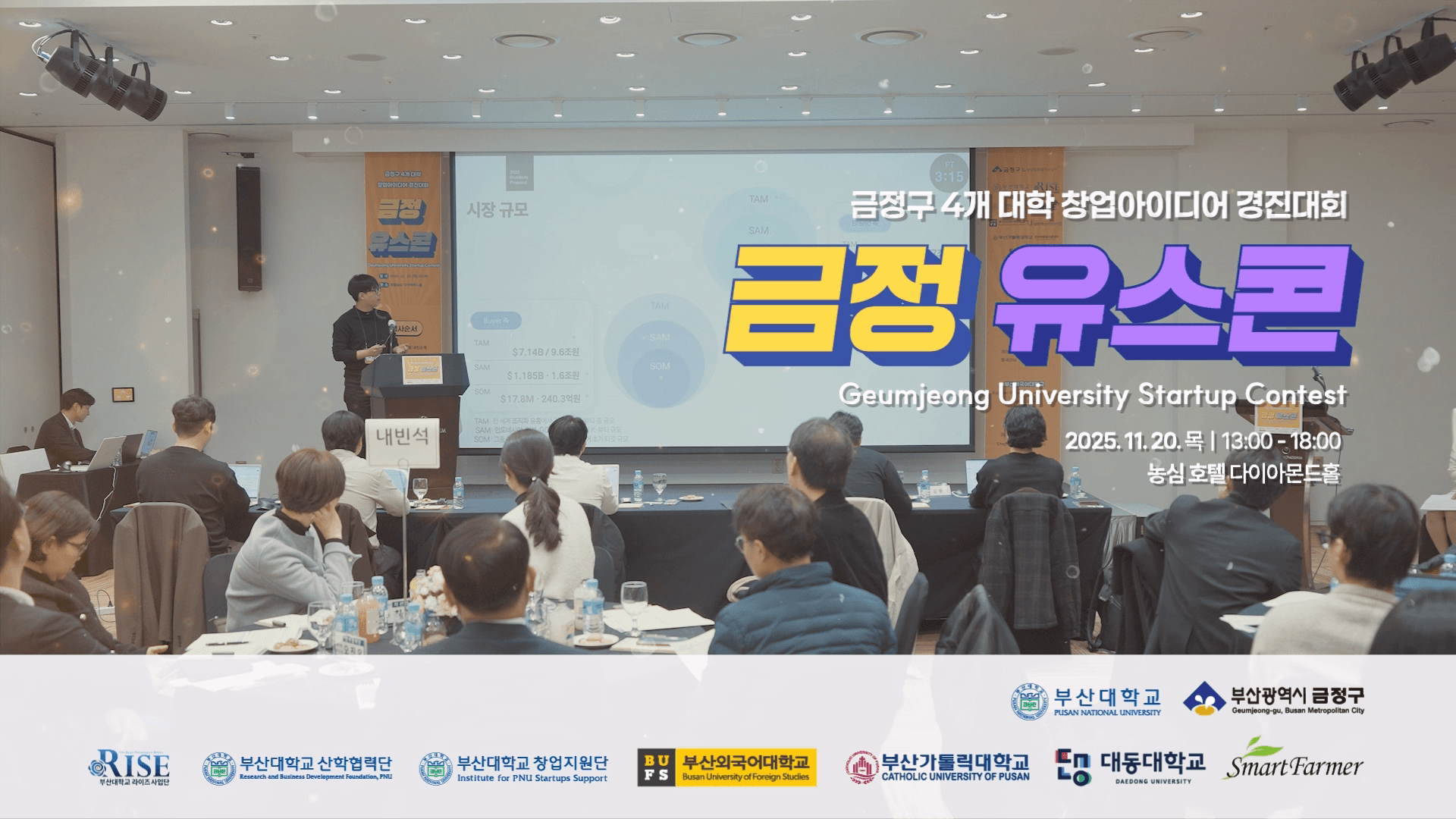 부산대학교 창업지원단을 비롯한 금정구 관내 4개 대학이 연합하여 개최한 '2025 금정 유스콘 창업아이디어 경진대회' 공식 하이라이트 영상입니다. 청년 창업가들의 번뜩이는 아이디어 피칭부터 치열한 심사, 그리고 영광의 시상식까지 현장의 역동적인 에너지를 밀도 있게 담아냈습니다. 자칫 단조롭고 딱딱해질 수 있는 심사·발표 위주의 스케치 영상에 통통 튀는 컬러감의 2D 인포그래픽과 트렌디한 자막 디자인(Lower-third)을 매칭하여, 대학생 창업 행사의 젊고 트렌디한 무드를 세련되게 브랜딩한 하이엔드 이벤트 필름입니다.